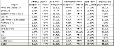 Download spreadsheetNote that even before the crisis, oil companies were shrinking, computers/peripherals had close to flat sales, and software dominates the list of high growth businesses. For a full list of growth rates, by industry, please click here. To see if there are differences in growth in different parts of the world, I then break down growth rates in revenues and net income, by region, between 2014 and 2019.