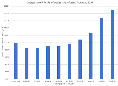 While this data is too raw to draw big conclusions from, higher PE stocks have, not surprisingly, have higher expected growth rates than low PE stocks. As investors, though, that tells you little about whether high PE stocks are good, bad or neutral investments, since the enduring question becomes whether (a) the high expected growth reflects reality or hopeful thinking on the part of analysts and (b) the PE ratio fully, under or over reflects this expected growth rate. It is one reason that I remain wary of using pricing screens to pick stocks, since there is no short cut or formula, that will answer this question. That will require a deep dive into the company's business model and full forecasting of earnings, cash flows and risk, i.e., an intrinsic valuation.