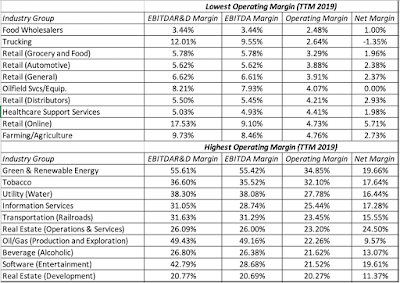 Margins: A Global OverviewAs with growth rates, I am going to begin by offering some background on the data that I use to compute my margins, and the adjustments that I make along the way. I use the revenues and income numbers from the trailing 12 months, which at the start of 2020, would give me the financials for most firms from October 2018 to September 2019. While that may seem short sighted, I have the archived numbers from the last decade on my website, for you to download and make your own judgments. Of course, with the market crisis fully upon us and a recession looming, you will be well served looking at the historical data. I start looking at margins across industries, to get a rough measure of how revenues flow through as earnings to the firm and its equity investors. In the table below, I list the ten industry groups with the highest and lowest operating margins, using global companies: