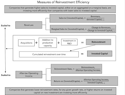 Reinvestment EfficiencyIf revenue growth captures the scaling up factor, and margins the profitability of a business, the last part of the story has to be about the efficiency with which the growth is delivered. For manufacturing companies, this will be captured in how much they spend in adding production capacity, and how efficiently they use this added capacity to produce more units. For non-manufacturing companies, the investment may be in research and development, acquisitions and other "intangibles", but it too is reinvestment and its payoff in growth affects value. For retail firms, it may take the form of inventory, accounts receivable and other ingredients of working capital, and how well they can manage these as they grow.