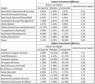 Reinvestment Measures: A Global Overview I noted at the start of this post that "ease of scaling up" has become a central theme of young growth companies reaching into new and often very large markets. While this has always been a selling point for conventional software and technology firms, it has expanded its reach into other businesses, from Uber in car service/logistics to Casper in mattress sales. In essence, the selling point for these models is that they can reinvest much more efficiently than their established competitors, though their growth pitch is still more focused on sales than on profits. In this section, I report on investment efficiency numbers, staying true to my premise that reinvestment has to include acquisitions and R&D. To get a sense of how investment efficiency varies across industries, I computed sales to invested capital and returns on capital, across industry groups, and in the table below, I report on the ten most and ten least efficient industries, at least when it comes to delivering revenues for every dollar of capital invested.