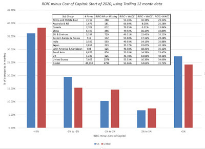 With the caveat in mind that the returns on capital that I compute for individual companies reflects operating income in 2019, a potential problem given that it is just one year and a number that clearly will change (and fairly dramatically so) because of the virus, I compared the return on capital to the cost of capital for each of the 39,000 non-financial service companies in my sample and used that comparison to create a global distribution of excess returns: