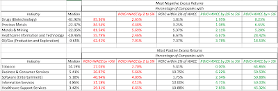 The story here is a depressing one, at least for this comparison, as 54% of global companies generated returns on capital that were lower than their costs of capital by 2% or more, and 32% of global companies earned returns that exceeded their costs of capital by 2% or more; 14% of companies earned returns that were within 2% of their costs of capital. The only part of the world where more companies earned more than their cost of capital than earned less was Japan, and even there, there are questions about whether this is an artifact of Japanese accounting practices rather than a sign of value creation. To complete the assessment, I looked at excess returns generated, by industry, and created a listing of the five industry groups with the most positive and the five with most negative median excess returns: