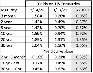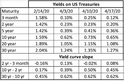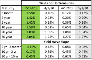 Download dataThe divide in the two periods is clear. Consider the S&P 500, down 28.28% between 2/14 and 3/20, but up 22.82% from March 20 and May 1, resulting in an overall return of -11.92% over the period. While the magnitudes vary across the indices, the pattern repeats, with the Shanghai 50 close to breaking even over the entire period, and the Bovespa (Brazil) and the ASX 200 (Australia) delivering the worst cumulative returns between 2/14 and 5/1. As stock markets have swooned and partially recovered, the yields on US treasuries dropped sharply early in the crisis and have stayed low since.
