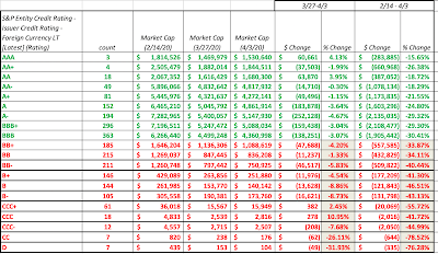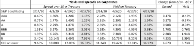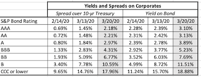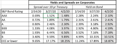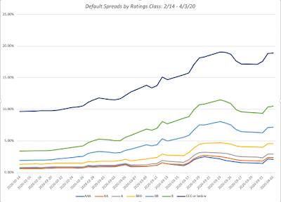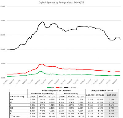 Download dataUS treasury rates dropped in the first weeks of the crisis, and with 3-month yields dropping close to zero and 10-year rates declining below 1%. While it is convenient to attribute everything that happens to interest rates to the Fed, note that much of the drop in rates occurred before the Fed's two big moves, the first one on March 15, where the Fed Funds rate was cut by 0.5% (almost to zero) and a $700 billion quantitative easing plan was announced, and the second one on March 23, when the Fed lifted the cap on its easing plan and extended its role as a backstop in the corporate bond and lending markets. While treasury rates were not affected much by the Fed's actions, its entry into the corporate bond market played a key role in turning the tide, where default spreads across ratings classes had been on the rise since February 14: