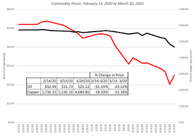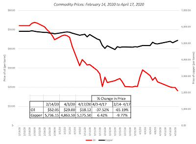 Download dataThe equity risk premium surged early in the crisis, hitting a high of 7.75% on March 23, but that number has been dropping back over the last weeks, as the market recovers. By May 1, 2020, the premium was back down to 6.03%, with pre-crisis earnings and cash flows left intact, and building in a 30% drop in earnings and a 50% decline in buybacks yields an equity risk premium of 5.39%. For good reasons or bad, the price of risk in the equity market seems to be moving back to pre-crisis levels. I don’t track commodity prices on a regular basis, but I chose to track oil and copper prices since February 14: