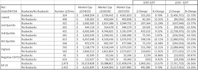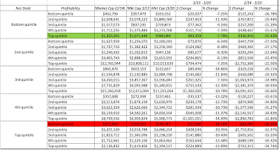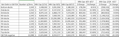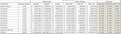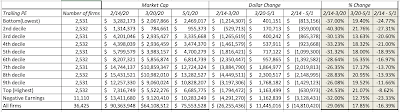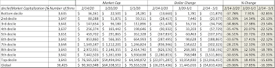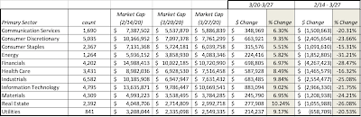 Equity BreakdownI have been downloading company-level data on publicly traded companies, at the end of each week for the last 15 weeks, and looking at changes in market capitalization across different classes of stocks. That allows me to see to not only get a more complete measure of market damage than just looking at indices, but to also use the data to double check assertions about causality.