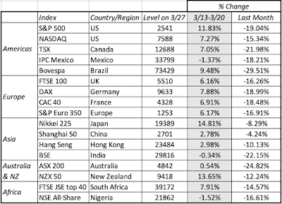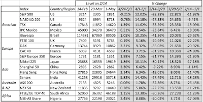 Market ActionAs with my prior updates, I will begin by surveying the market action, first over the two weeks (4/17-5/1), following my last update, and then looking at the returns since February 14, the date that I started my crisis clock. First up, I look at returns on stock indices around the world, breaking them up into two periods, from February 14 to March 20, roughly the low point for markets during this crisis and from March 20 to May 1, as they mounted a comeback.
