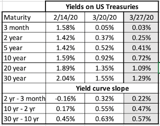 Download dataBetween February 14 and March 20, it was a precipitous drop with almost equity index in the world down between 30-40%, with the Chinese markets being the exceptions, a bear market compressed into five weeks. Since March 20, though, it has been not just an up market, but one that has climbed steeply. For instance, the S&P 500 which dropped a little over 28% between February 14 and March 20, had recouped most of those losses by June 1, and is now down only 5.29% since February 14. Two emerging market indices, the Bovespa (Brazil) and the Sensex (India), and one developed market index, the CAC (France), have still lost more than 20% of their value over the period. Moving on to treasuries, the immediate effect of the crisis was a flight to US treasuries, where yields dropped across the board:
