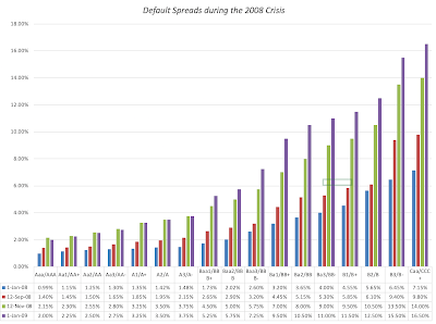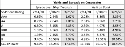 Download dataNote that almost all of the yield drop occurred before March 15, when the Fed announced its quantitative easing actions. The fear factor in the first few weeks that caused the flight to treasuries also pushed up default spreads on corporate bonds: