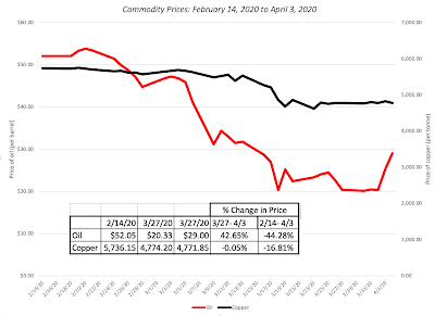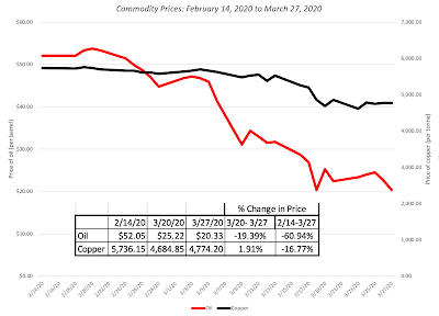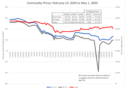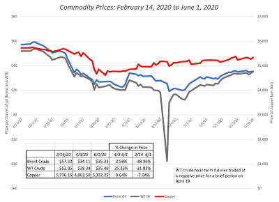Download dataNote the dramatic surge in spreads between February 14 an April 3, with a tripling in the spread on BBB rated bonds. Like equities, corporate bonds seem to have entered a more sanguine period, with spreads on June 1, 2020, down significantly from their highs in early April. I have also been tracking two commodities, oil and copper, to measure how a global economic showdown is affecting prices: