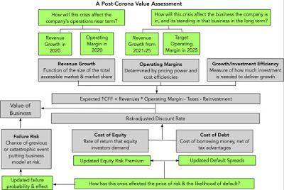 In my first viral market update, I sketched a picture of the drivers of value for the market, drawing on fundamentals. I revisited that picture and tweaked it to reflect the uncertainties that investors face about the future, broke down into near term (2020 & 2021) and the long term (in the years through 2024):