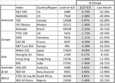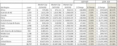 Equities: A BreakdownStarting with the market capitalizations of individual companies, I measured the change in market capitalization on a week to week basis, allowing me to slice and dice the data to chronicle where the damage has been greatest and where it has been the least. Breaking down companies by region, here is what the numbers updated through May 1 look like: