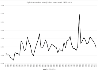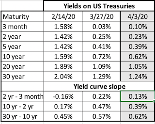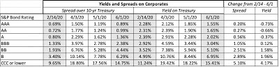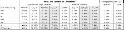 Download dataThe 3-month treasury bill rate, which was 1.58% on February 14, has dropped close to zero on May 1, and the treasury bond rate has declined from 1.59% to 0.64% over the same period. The much talked about inverted yield curve late last year, that led to so many prognostications of gloom and doom, has become upward sloping, and staying consistent with my argument that too much was being made of the former as a predictor of recession, I will not read too much into its slope now. Moving to the corporate bond market, I focused on 10-year corporates in different ratings classes:
