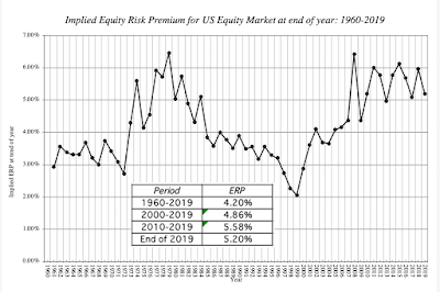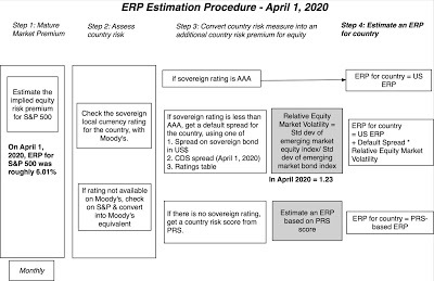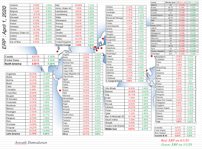 As with earnings, this crisis will result in cash flow shocks, and dividends and buybacks will drop this year. Given that dividends tend to be stickier than buybacks, the drop will be lower fro the former than the latter. Analysts vary on how much, though, with a range of a drop of 30-70% in buybacks and 10-30% in dividends.Risk: Every crisis has consequences for risk premiums, as I noted in this post, and it is for that reason that I have been updating equity risk premiums, by day, since February 14.