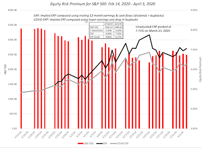Download dataEarly in this crisis, the corporate bond markets did not reflect the worry and fear that equity investors were exhibiting, but they caught on with a vengeance a couple of weeks in, and the damage was clearly visible by April 3, 2020, with default spreads almost tripling across the board for all ratings classes. Since April 3, the spreads have declined, but remain well above pre-crisis levels. There should be no surprise that the price of risk in the bond market has risen, and as the crisis has taken hold, I have been updating equity risk premiums daily for the S&P 500 since February 14, 2020: