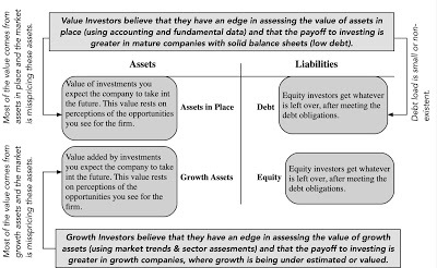 The DifferenceFor decades, we have accepted a lazy categorization of stocks on the value versus growth dimension. Stocks that trade at low PE or low price to book ratios are considered value stocks, and stocks that trade at high multiples of earnings and book value are growth stocks. In fact, the value factor in investing is built around price to book ratios. If you are a value investor, your reaction to this categorization is that this is no way to describe value and that true value investing incorporates many other dimensions including management quality, sustainable moats and low leverage. Conceding all those points, I would argue that the key difference between value and growth investing can be captured by looking at a financial balance sheet:
