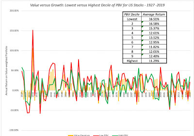 The Lead InUntil the last decade, it was conventional wisdom that value investing beat growth investing, especially over longer time horizon, and the backing for this statement took the form of either anecdotal evidence (with the list of illustrious value investors much longer than the list of legendary growth investors) or historical data showing that low price to book stocks have delivered higher returns than high price to book stocks: