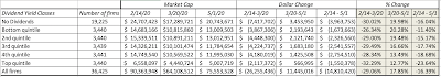 The results mirror what we saw with PE stocks, with low price to book stocks losing far more value than the highest price to book stocks. I then break down stocks based upon dividend yields: