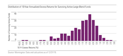 The Lead InUntil the 1970s, active investing dominated passive investing for two simple reasons. The first was the presumption that institutional investors were smarter, and had access to more information than the rest of us, and should thus do better with our money. The second was that there were no passive investing vehicles available for average investors. Both delusions came crashing down in the late sixties and early seventies.First, the pioneering studies of mutual fund performance, including this famous one that introduced Jensen's alpha, came to the surprising conclusion that rather than outperform markets, mutual funds under performed by non-trivial amounts. In the years since, there have been literally hundreds of studies that have asked the same question about mutual funds, hedge funds and private equity, using far richer data sets and more sophisticated risk adjustment models to arrive at the same result. You can see Morningstar's 10-year excess return distribution for all active large-blend mutual funds, from 2010-2019, below (with similar graphs for other classes of active mutual funds):