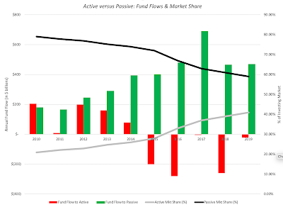If the counter is that it is hedge and private equity funds where the smart money resides today, the evidence with those funds, once you adjust for reporting and survivor bias, mirrors the mutual fund results. Put bluntly, "smart" money is not that smart, and the advantages that it possesses (bright people, more data, powerful models) don't translate into returns for its investors. Ironically, over the same period, there were hundreds of other studies that claimed to find market inefficiencies, at least on paper, suggesting that there is no internal inconsistency in believing that markets are inefficient and also believing that bearing these markets is really, really difficult to do.Second, Jack Bogle upended investment management in 1976 with the Vanguard 500 Index fund, the most disruptive change in the history of the investment business. Over the next three decades, the index fund concept expanded to cover geographies and asset classes, allowing investors unhappy with their investment advisors and mutual funds to switch to low-cost alternatives that delivered higher returns. The entry of ETFs tilted the game even further in favor of passive investing, while also offering active investors new ways of playing sectors and markets.The shift of funds from passive to active has been occurring for a long time, but the shift was small early in the process. In 1995, less than 5% of money was passively invested (almost entirely in index funds) and that percentage rose to about 10% in 2002 and 20% in 2010. In the last decade, that shift has accelerated, as you can see in the graph below: