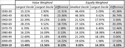 Source: Raw Data from Ken FrenchLooking across the entire period (1927-2019), low price to book stocks have clearly won this battle, delivering 5.22% more than high price to book stocks, and this excess return is almost impervious to risk and transaction cost adjustments. Value investors entered the last decade, convinced of the superiority of their philosophy, and in the table below, I look at the difference in returns between low and high PE and PBV stocks, each decade going back to the 1920s.