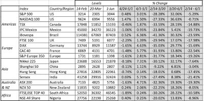 Updating the MarketAs with my previous updates, I will start with a chronicling of how markets have behaved in the two weeks since my last update, and overall, during the crisis. Let's start with equity indices, where we saw one week of relative stability (5/29-6/5) and a week of drama (6/5-6/12), after surges in April and May: