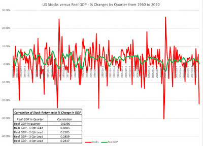 Markets and the EconomyThe notion that stock markets and economies are closely tied together is deeply held, simply because it appeals to intuition. After all, how can stocks keep going up if the economy is doing badly? While I concede that the right answer is they cannot, there are three factors that may delink the two.The first is that stocks are driven by earnings, not real growth in the economy or employment, and to the extent that companies can continue to generate income, even in stagnant or declining economies, you may see stock prices rise. The second is that the “economy” that stocks are tied to does not always have to be the domestic one, since globalization has made it possible for companies to continue to prosper in slow-growing economies. The third is time, since stock markets are prediction machines, albeit with a lot of noise and error, the link between markets and the economy, even if it exists, will be with a lag of months or longer. To those who prefer a data-based argument, the graph below plots US stock market returns against real GDP growth in the United States, using quarterly data.