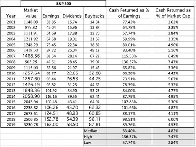 As of right now, there seems to be only nascent attempts to forecast long term damage to earnings, but a consensus is forming that there will be some.Cash Return: In 2019, companies in the index returned 146.30 in cash to stockholders, 57.5 in dividends and 87.8 in buybacks, amounting to 89.75% of earnings in that year. This represented a continuation of a trend through the decade of increasing buybacks and cash return: