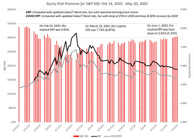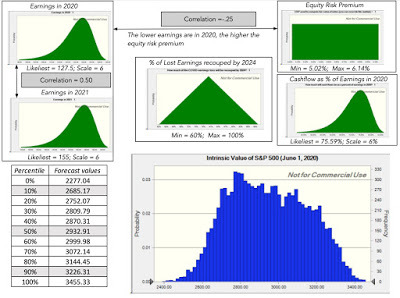 Download simulation results (Oracle Crystal Ball used in simulation)Note that I have centered the simulations around the median estimates of earnings for 2020 and 2021 from analysts, while building in the range in the estimates into the distributions. The median value from the simulation is 2932. On June 1, the S&P 500 was trading at close to 3100, putting it near the 80th percentile of the distribution, bolstering the "market has gotten ahead of itself" camp, but there is something here for everyone. If you are more optimistic about earnings in 2020 and 2021 than the the median analyst, and about how quickly and completely the market will recover from the crisis shock, you will arrive at a higher value than mine. If you are more pessimistic about the future, perhaps because you think the market is under estimating the likelihood of a second wave of shutdowns or a surge in company defaults, your valuations will be much lower.