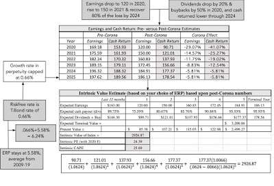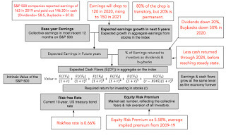 Spreadsheet to value the index (June 1, 2020)Simulation results for S&P 500 valuation (June 1, 2020)Google Shared Spreadsheet (for your S&P 500 valuations)Google Shared SpreadsheetViral Market Update PostsA Viral Market Meltdown: Fear or Fundamentals?A Viral Market Meltdown II: Pricing or Valuing? Investing or Trading?A Viral Market Meltdown III: Clues in the Market DebrisA Viral Market Meltdown IV: Investing for a post-virus EconomyA Viral Market Meltdown V: Back to BasicsA Viral Market Meltdown VI: The Price of RiskA Viral Market Meltdown VII: Market MultiplesA Viral Market Meltdown VIII: Value vs Growth, Active vs Passive, Small Cap vs Large!A Viral Market Meltdown IX: A Do-it-Yourself S&P 500 Valuation