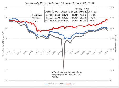 Default spreads followed the path of equities, widening significantly between February 14 and March 20, and falling back by June 12, albeit to levels higher then on February 14. The fear about how the pandemic would slow economic growth also affected commodity prices, and I chart the path of copper and oil, two commodities sensitive to global economic growth below: