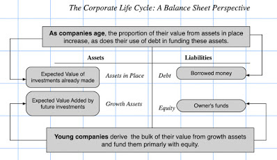 In general, negative cash flows (cash burn) are a feature of young companies, cash build ups occur as companies grow and mature, and declining companies return cash as they shrink. Finally, to understand how companies change as they move through the life cycle, I will draw on another general construct, the financial balance sheet: