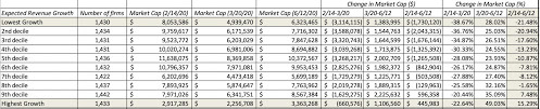 Download dataThe table tells an interesting story. In the down phase (2/14-3/20), there was little distinction between younger and older firms, as firms in every age group lost about 30% of value. In the second phase from 3/20 to June 12, younger companies have seen a much more robust comeback than older firms, resulting in much lower negative returns over the entire period for younger firms (the bottom five deciles) than older ones (the top five deciles). You could argue that company age is not a composite measure of where a company falls in the life cycle, since some companies move through the life cycle faster than others. To counter this critique, I break firms down by expected revenue growth, as estimated prior to the crisis, building on the assumption that expected revenue growth should be highest for young firms and lower for firms further along in the life cycle: