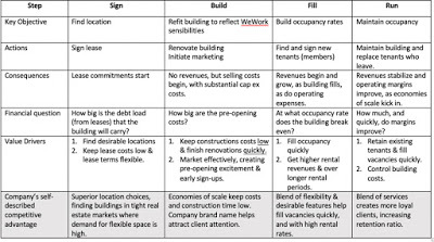 The WeWork business model puts a twist on traditional real estate. Like the conventional model, it starts by identifying an attractive office property, usually in a city where office space is tight and young businesses are plentiful. Rather than buying the building, WeWork leases the building with a long term lease, and having leased it, it spends significant amounts upgrading the building to make it a desirable office space for the Gen-X and Gen-Y workers, brought up to believe in the tech company prototype of a cool office space. Having renovated the building, WeWork then offers office space in small units (you can rent just one desk or a few) and on short term contracts (as short as a month). For a given property, if things go according to plan, as the building gets occupied, the excess of rental income (over the lease payment) is used to cover the renovation costs, and once those costs get covered, the economies of scale kick in, generating profits for the company. The steps in the WeWork business model are captured in the picture below: