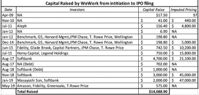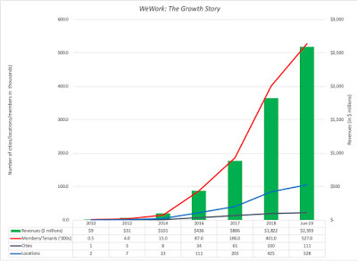 With Theranos, Elizabeth Holmes was the story teller, arguing that her nanotainers would upend the (big) blood testing business and in the process, make it accessible to people around the world who could not afford it. Investors, Walgreens and the Cleveland Clinic all swooned, and no one asked questions about the blood tests themselves, afraid, perhaps, of being viewed as being against making the world a healthier place. For much of its life, WeWork has had many of the same ingredients, a visionary founder, Adam Neumann, who seems to view the company less as a business and more as a mission to make the business world a little more equal by giving the underdogs (young start-ups, entrepreneurs and small companies) a base, at least in terms of office space and community support, to fend off bigger competitors. It is no surprise, therefore, that the company describes its clients as community and members and that the word "We" carries significance beyond the company name. Along the way, the company was able to get venture capitalists to buy in, and the pricing of the company reflects its rise: