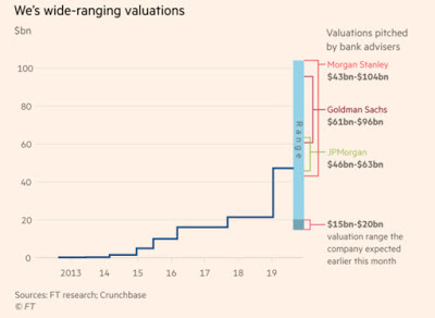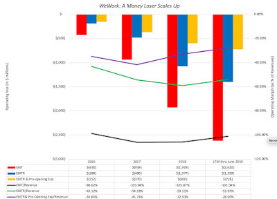 Once investors lose faith in the narrator, the same story that evoked awe and sky-high pricing in the runaway model starts to come apart, as the flaws in the model and its disconnect with the numbers take center stage. With WeWork, the shift seems to have occurred in record time, partly because of bad market timing, with the macro indicators indicating that a global economic showdown may be coming sooner rather than later, and partly because of its own arrogance. In fact, if you were mapping out a plan for self-destruction, the company has delivered in spades with:CEO arrogance: For someone who is likely to be a multi-billionaire in a few weeks, Adam Neumann has been remarkably short sighted, starting with his sale of almost $800 million in shares leading into the IPO, continuing with his receipt (which he reversed, by only after significant blowback) of $6 million for giving the company the right to use the name “We”, and the conflicts of interest that he seems to have sowed all over the corporate structure. Accounting Game playing: WeWork’s continued description, with more than a 100 mentions in its prospectus, of itself as a tech company is at odds with its real estate business model, but investors would perhaps have been willing to overlook that if the company had not also indulged in accounting game playing in the past. This is after all the company that coined Community EBITDA (https://www.bloomberg.com/opinion/art...), an almost comically bad measure of earnings, where almost all expenses are added back to derive arrive at earnings. Denial: Since even a casual observer can see the mismatch that lies at the heart of the WeWork business model, it behooves the company to confront that problem directly. Instead, through 220 pages of a prospectus, the company bobs and weaves, leaving the question unanswered.While these are all long standing features of the company, I think that if pricing is a game of mood and momentum, the mood has darkened during this period, and it came as no surprise when rumors started a couple of days ago that the company was considering slashing its pricing to $20 billion a lower. That is an astounding mark down from the initial pricing estimate, but it suggests that the company and its bankers are running into investor resistance.