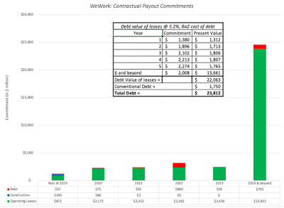 2. Leverage: The Leasing MachineThe WeWork business model is built on leasing properties, often for large amounts, with a long-period commitment, and not surprisingly, the results are manifested in lease commitments that represent a mountain of claims that the company has to cover before it can generate income for equity investors. The graph below captures the lease commitments that WeWork has contractually committed itself to for future years, and how much these commitments represent in equivalent debt: