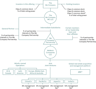 Prospectus: PageIn particular, note the carve out of a separate company (ARK) which will presumably buy real estate and lease it back to We and the region-specific joint ventures, where the company collects management fees. I am not quite sure what to make of the partnership triangle at the center, where it looks like the company will be partnering with it's own managers (with the founder/CEO presumably leading the way) to run WeWork Company. I have to compliment the company's owners and bankers, and it is a back-handed compliment, for managing to create more complexity in a couple of years than most companies can create in decades. Some of this complexity is probably due to tax reasons, in which case the company is behaving like other real estate ventures in putting tax considerations high up on its list of decision-drivers. Some of the complexity is to protect itself from the downside of its own lease-fueled growth, where the company can maintain the argument that since its leases are at the property-level, and the properties are structured as nominally stand-alone subsidiaries, it is less exposed to distress. That is fiction because a global economic showdown will lead to failures on dozens, perhaps hundreds, of lease commitments at the same time, and there is no protective cloak for the company against that contingency. A great deal of the complexity, though, has to do with the founder(s) desire for control and potential conflicts of interests, and investors will have to take that into account when valuing/pricing the company.