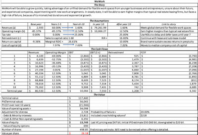 Download spreadsheetI am sure that I will get pushback from both directions, with optimists arguing that the unmet demand for flexible office space in conjunction with the WeWork brand will lead to higher revenue growth and margins, and pessimists positing that both numbers are overstated. In response, here is what I can offer: