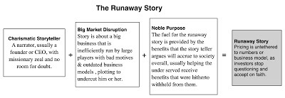 Storytelling's Dark Side: The Meltdown of Runaway StoriesValuation is a bridge between stories and numbers, and for young companies, it is the story that drives the numbers, rather than the other way around. This is neither good nor bad, but a reflection of a reality which is that bulk of value at these companies comes from what they will do in the future, rather than what they have done in the past. That said, there is a danger when stories rule, and especially so if the numbers become props or are ignored, that the pricing that is attached to a company can lose its tether to value. In 2015, I used the notion of a runaway story to explain why VC investors pushed up the price of Theranos to $9 billion, without any tangible evidence that the revolutionary blood testing, that was at the basis of that value, actually worked. In particular, I suggested that there are three ingredients to a runaway story: