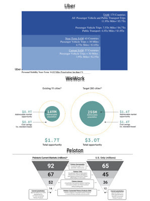 1. Unbounded Potential MarketsIt is natural that companies, especially early in their lives, puff up their business descriptions and inflate their potential markets, but the companies that have gone public this year seem to have taken it to an art form. Lyft, which went public before Uber, described themselves as a transportation company, a little over-the-top for a car service company, but Uber topped this easily, with their identification as a personal mobility company. WeWork, in its prospectus, steers clear of ever describing itself as being in real estate, framing itself instead as a community company, whatever that means. Peloton, in perhaps the widest stretch of all, calls itself a technology, media, software, product, experience, fitness, design, retail, apparel and logistics company, and names itself Peloton Interactive for emphasis. In conjunction with these grandiose business descriptions, each of the company's IPOs also lists a total addressable or accessible market (TAM) that it is targeting. While this is a measure, initiated with good sense , it has become a buzzword that means close to nothing for these young companies. In the picture below, I have taken the total market descriptions given in the Uber, WeWork and Peloton prospectuses: