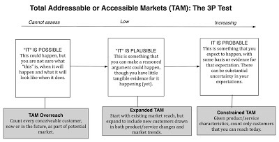 With Uber, for instance, my initial estimate of the car service market in June 2014, while defining the magnitude of the car services market then, was a constrained TAM and, in hindsight, it proved far too limited, as Uber's pricing and convenience drew new customers into the market, expanding the market significantly. It is a lesson that I have taken to heart, and I do try to give disruptive companies the benefit of the down in estimating TAM, erring more towards the expanded TAM definition. That said, the total market claims that I see outlined in the prospectuses of the companies that have gone public this year, while perhaps meeting the possible test, fail the plausible and probable tests. That TAM overreach makes the cases for these companies weaker, rather than stronger, by making them less credible.