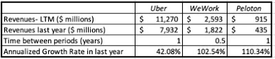 As a confession, I started this post intending to write about Peloton, the next big new offering hitting markets, but I got distracted along the way. As I read the Peloton prospectus, with the descriptions of its business, its measure of total market size and its success at scaling up revenues accompanied by large losses, I had a feeling of déjà vu, since other prospectuses that I had read this year from Lyft, Uber, Slack, Pinterest and, most recently, WeWorks, not only shared many of the same characteristics, but also used much of the same language. I briefly considered the possibility that these companies were using a common prospectus app, where given a bare bones description, a 250-page prospectus would be generated, complete with the requisite buzz words and corporate governance details. Setting aside that cynical thought, I think it is far more likely that these companies are emphasizing those features that allowed them to get to where they are today, and that examining these shared features should give us insight into how venture capitalists price companies, and the dangers of basing what you pay on VC pricing. To keep my write up from becoming too long (and I don't think I succeeded), I will use only Uber, WeWork and Peloton to illustrate what I see as the commonalities in their investment pitches, when I could have spread my net wider to include all IPOs this year.
