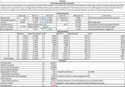 A Peloton ValuationSince I started this post intending to value Peloton, I might as sell include my valuation of the company, especially since the company has released an updated prospectus with an estimated offering price of $26 to $30 per share. The company posits that there will 277.76 million shares outstanding (across voting share classes), but it also very clearly states that this does not include the 64.6 million options outstanding.