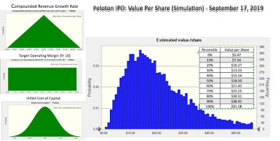 In terms of base numbers, the simulation does not change my view of Peloton. My median value is $18.30, with the tenth percentile at close to zero and the ninetieth percentile at $38.42, making it still over valued, if it is priced at $26/share. The long tail on the positive end of the distribution implies that I would buy Peloton with a smaller margin of safety than a more mature company, because of the potential of significant upside. (I have a limit buy, at $15/share. Given the offering price of $26-$29, there is little chance that it will execute soon, but I can play the long game).