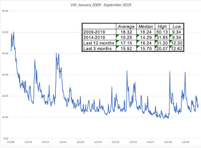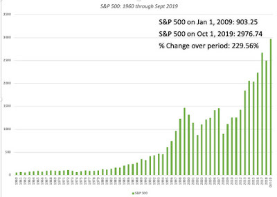 The equity risk premium for the S&P 500 on October 1, 2019, was 5.55%, and by itself, you may not know what to do with this number, but the graph below shows how this number has changed between 2009 and 2019: