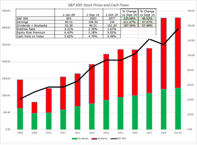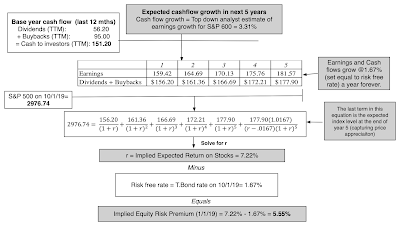 Implied Equity Risk Premiums: A Composite IndicatorDid you think I would have an entire post on stock markets, without taking a dive into implied equity risk premiums? Unlike PE ratios that focus just on stock prices or treasury bond rates that focus just on the alternative to stocks, the implied equity risk premium is a composite number that is a function of how stocks are priced, given cash flows and expected growth in earnings, as well as treasury bond rates. In my monthly updates for the S&P 500, I compute and report this number and as of October 1, 2019, here is what it looked like: