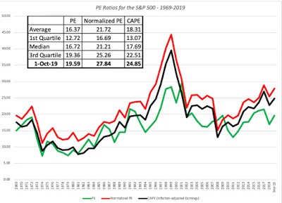 Download raw data on PE ratiosNote that on October 1, 2019, all three measures of the PE ratios for the S&P 500 are higher than they have been historically, if you compare them to the median levels, with the PE at the 75th percentile of values over the 50-year period, and normalized PE and CAPE above the 75th percentile. Proponents then complete the story using one of two follow up arguments. One is that mean reversion in markets is strong and that the values should converge towards the median, which if it occurs quickly, would translate into a significant drop in stock prices (35%-40% decline). The other is to correlate the l PE ratio (in any form) with stock returns in subsequent periods, and show that higher PE ratios are followed by weaker market returns in subsequent periods.