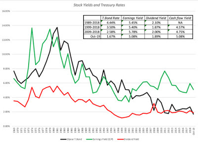 Counter Argument 2: Stocks are richly priced, relative to history, but not relative to alternative investments todayIf you are convinced by one of the arguments above that stocks are over priced and choose to sell, you face a question of where to invest that cash. After all, within the financial market, if you don't own stocks, you have to own bonds, and this is where the ground has shifted the most against those using the mean reversion argument with PE ratios. Specifically, if you consider bonds to be your alternative to stocks, the drop in treasury rates over the last decade has made the bond alternative less attractive. In the graph below, I compare earnings yields on US stocks to T.Bond rates, and include dividend and cash yields in my comparison: